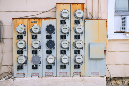 Electricity meters on panel in an apartment building. Samui, Tailand - 06/02/2020