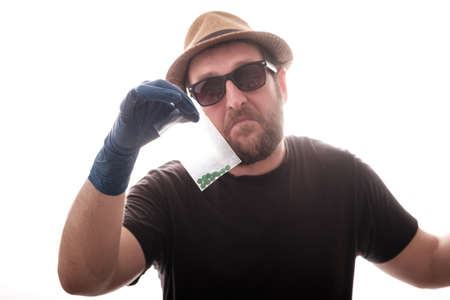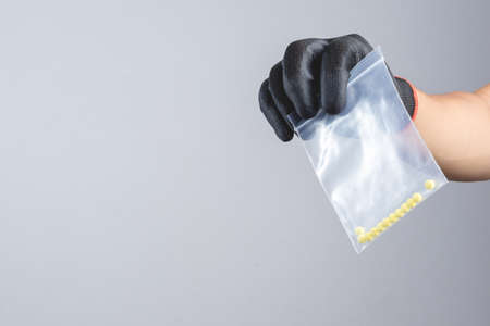 Hand wearing dark glove holding illegal drugs in plastic zip bag as a smuggling dealer on white background