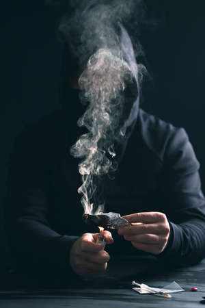 Addict/junkie man preparing drugs. The concept of crime and drug addiction.