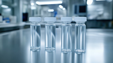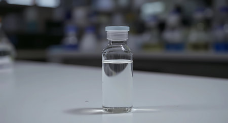 A single clear glass medical vial filled with transparent liquid or vaccine, placed on a clean white surface in a laboratory setting with a blurred research background.