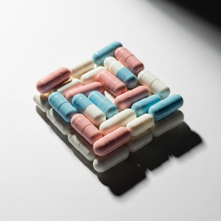 Colorful capsules are spilling from a glass jar onto a soft pastel surface, highlighting vibrant colors and textures, symbolizing health and wellness in a creative way