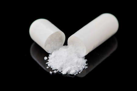 capsules tablets powder closeup on a mirrored surface close up, macro, picture with depth of field