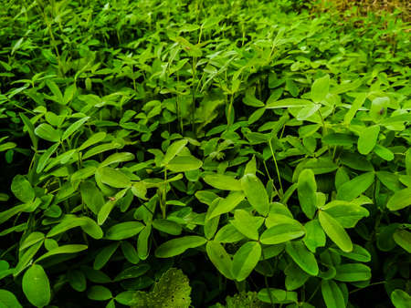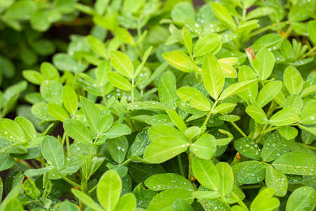 Close​-up background of bright green peanut leaves. Growing groundnut seeds for growing peanuts Dense green leaves. Refreshing natural background.