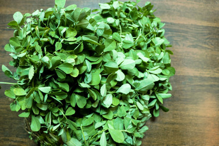 A bunch of fresh green fenugreek leaves (methi) placed on a wooden surface. Ideal for use in culinary, organic food, and herbal health-related themes.