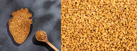 Dried, raw fenugreek seed in measuring scoop on dark moody black kitchen table background top view flat lay from above with selective focus