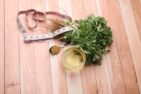 Close up of Fenugreek with its seeds and powder and the extracted water. It helps in numerous digestive problems etc.