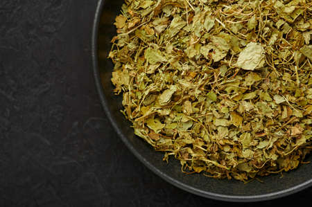 Dry Kasuri Methi or Fenugreek in black bowl on dark slate table top. Dried Fenugreek is the popular seasoning of many asian cuisines.