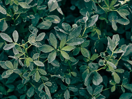 Stems with leaves of the young alfalfa covered with dew drops on field closeup in summer morning