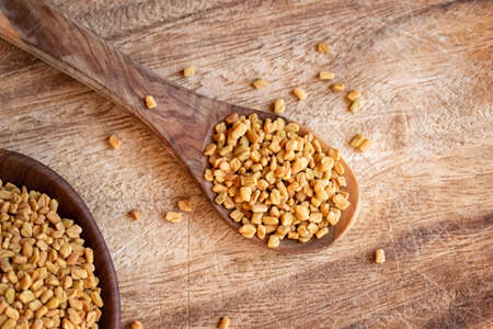 Fenugreek seeds on a spoon, top view