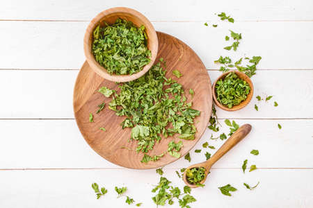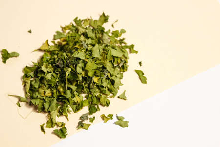 Dried parsley leaves lie in a small pile on a light background. Top view, selective shot.