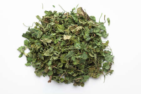 Macro close-up of Organic green dry Fenugreek leaves (Trigonella foenum-graecum) on white background. Pile of Indian Aromatic Spice. Top view