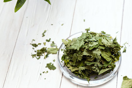 Dry currant leaves in a glass plate on a white wooden table. Composition with organic, natural, dry herbal tea