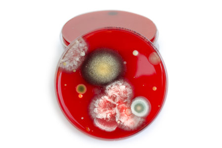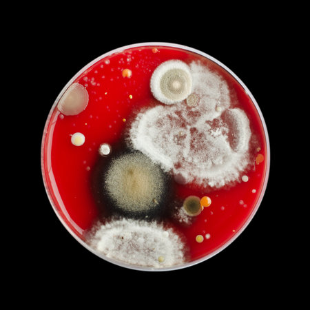 Bacterial and mold fungi colonies grown from hands skin surface on blood sheep agar, photograph showing microbial diversity and skin contamination.
