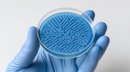 A detailed image showcasing microbial growth in a petri dish held by a gloved hand, emphasizing a sterile environment ideal for scientific research and education.