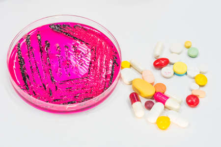 Petri dish or culture media with bacteria on white background with clipping, Test various germs, virus, Coronavirus, Corona, COVID-19, Microbial population count. Food science.