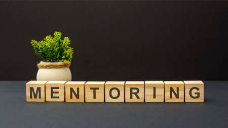 letters of the alphabet of mentoring on wooden cubes, dark surface. green plant. black background
