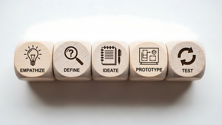 From a top-down perspective, a diverse team collaborates around a wooden table, their hands gesturing towards a series of cards with business process icons.