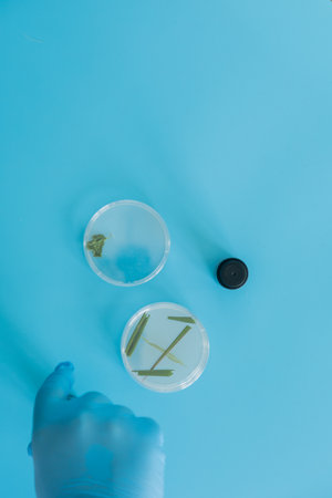 Production line pharmaceutical industry. Manufacturing of drugs and medications, pharmaceuticals. Laboratory gloves blue Petri dish