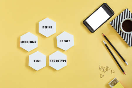 Creative desk with hexagon shapes of diagram Industry 4.0 project. Concept of modern approach to management company. White mock up phone screen.
