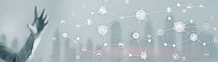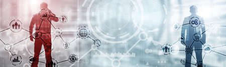 Communication network. Horizontal Panoramic Business Background. Organisational structure on virtual banner.