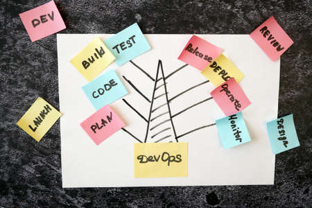 hands put on board words Dev and Ops. DevOps Concept for software engineering culture and practice of software development and operation, closeup