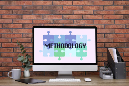 methodology concept. Workplace with modern computer on wooden table near brick wall