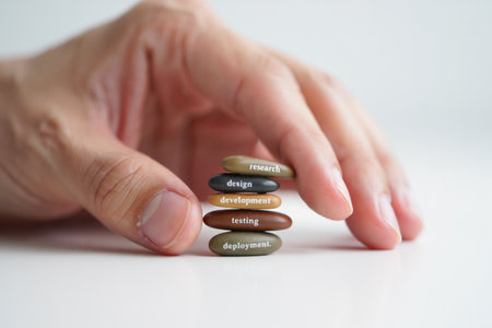 Hand holds stones. Research design development testing deployment. Business strategy concepts.
