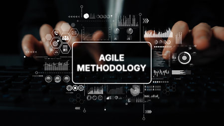 Hands Typing on a Keyboard with Overlays of Agile Methodology Concepts and Data Visualization Elements in a Dark Setting. Asymptotic smart data analytic.
