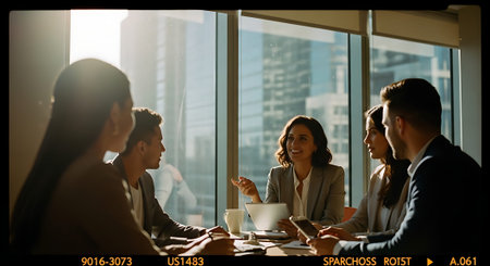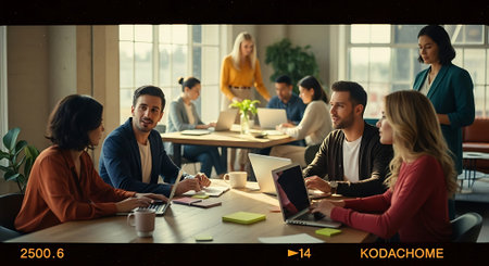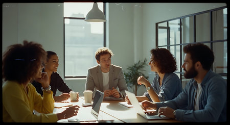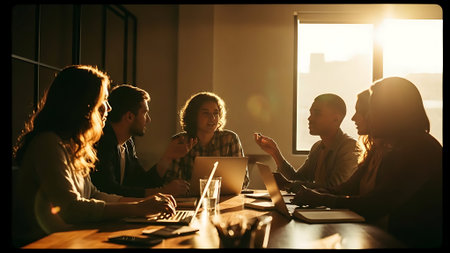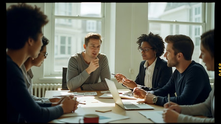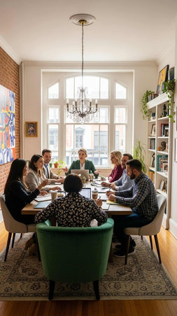 A diverse group of business professionals gathered at a modern office for a productive and inclusive meeting