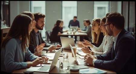 Group of business people discussing business plan at meeting in modern office. Businessman and businesswoman working together on project.