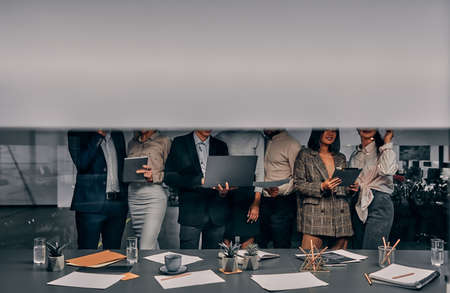 Photo of a group of business professional people standing and holding laptop tablets, documents and discussing work, their faces hidden by an advertising banner, place for text.