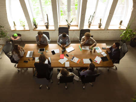 Aerial view of young people, co-workers during work process, meeting at office, indoors. Work, finance, tech and business concept.