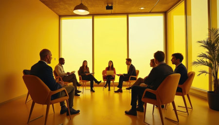 A group of diverse business professionals collaborate during a meeting in a modern, yellow-toned office space, fostering teamwork and discussion.