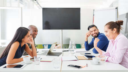 Beautiful business people are using gadgets, talking and smiling during the conference in office