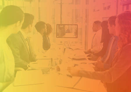Composition of colorful light over business people during meeting in office. business template concept digitally generated image.