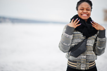 African woman wear in black scarf pose in frozen ice lake, winter day at Europe.