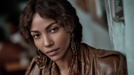 A young woman with curly hair poses with a thoughtful expression wearing a brown leather jacket in a warm and inviting cafe. Soft lighting enhances the intimate atmosphere around her.