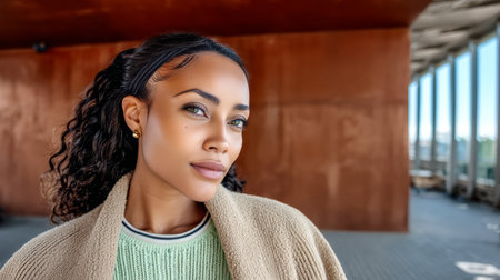 A young woman with curly hair wears a green sweater and a beige cardigan. She poses in a contemporary building with large windows and a warm-toned backdrop, showcasing her vibrant style.