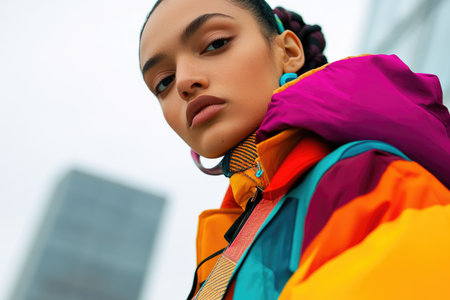 A young woman showcases her unique fashion sense in vivid colors, exuding confidence and energy.