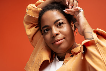 A confident plus-size Black woman poses in a stylish autumn outfit against a bright background.