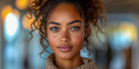Portrait of a beautiful young woman with striking hazel eyes and curly hair, bathed in warm light