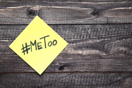Me Too hashtag word on white papers and people in wood of background. Me Too social movement hashtag against sexual assault and harassment.