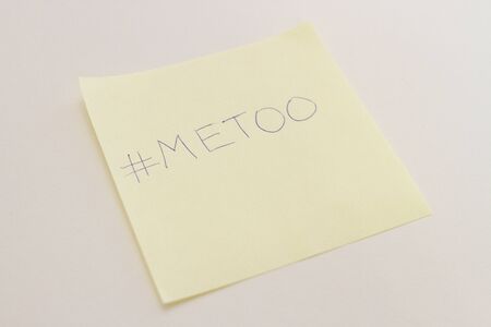 Yellow sticker of paper with hand drawn text Me Too on white background