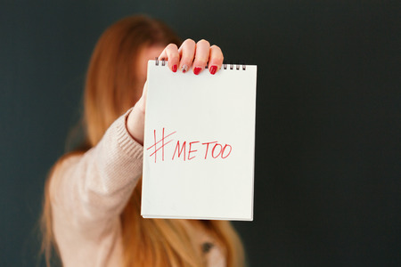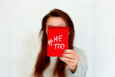 woman showing a note with the text me too