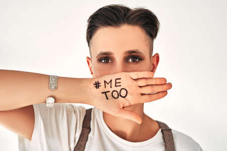 Close up view portrait of young woman covering her mouth Metoo hashtag word on palm of hand isolated on white. Me too movement. Anti sexism protest against inappropriate behavior towards women.