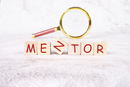The MENTOR concept word is collected of wooden cubes with a magnifying glass in the background. The concept of business and development.