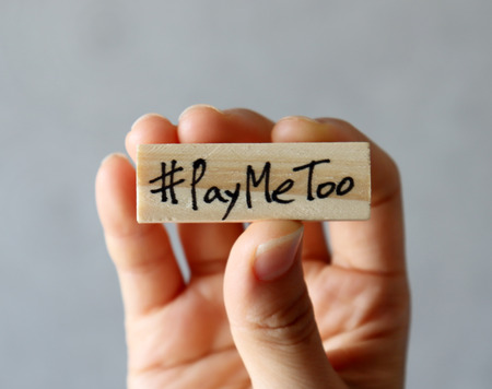 #PayMeToo movement concept. Hand holding a wooden block with #PayMeToo