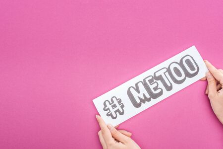 cropped view of woman holding paper with hashtag me too isolated on pink