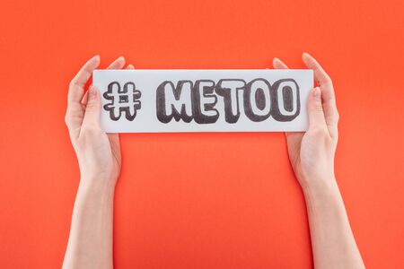 cropped view of woman holding with both hands paper with hashtag me too isolated on orange