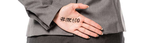 panoramic shot of businesswoman with me too lettering on hand isolated on white